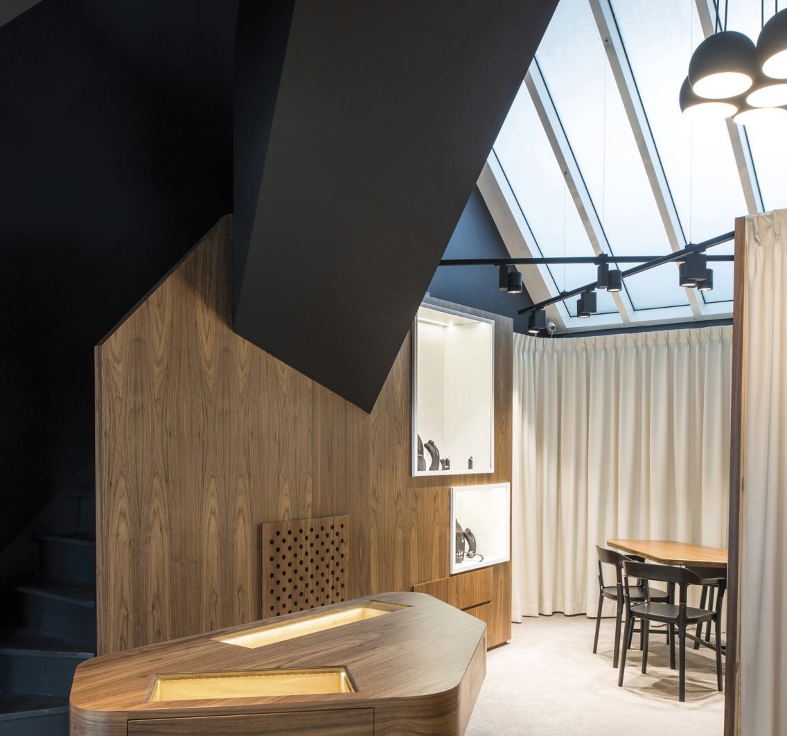 Chaque espace a été étudié avec soin pour déterminer la disposition optimale des luminaires et leur intensité. Les objectifs étaient clairs : mettre en valeur chaque bijou, éviter les reflets sur les vitrines et créer une ambiance accueillante et élégante.